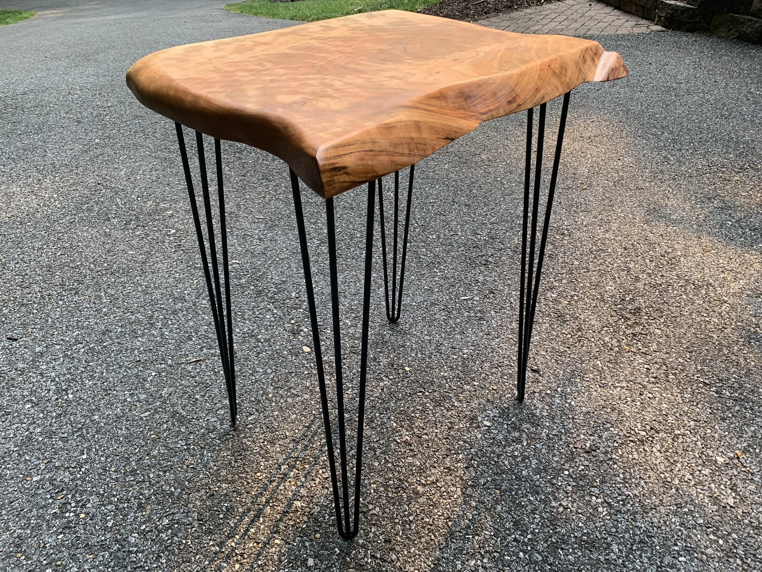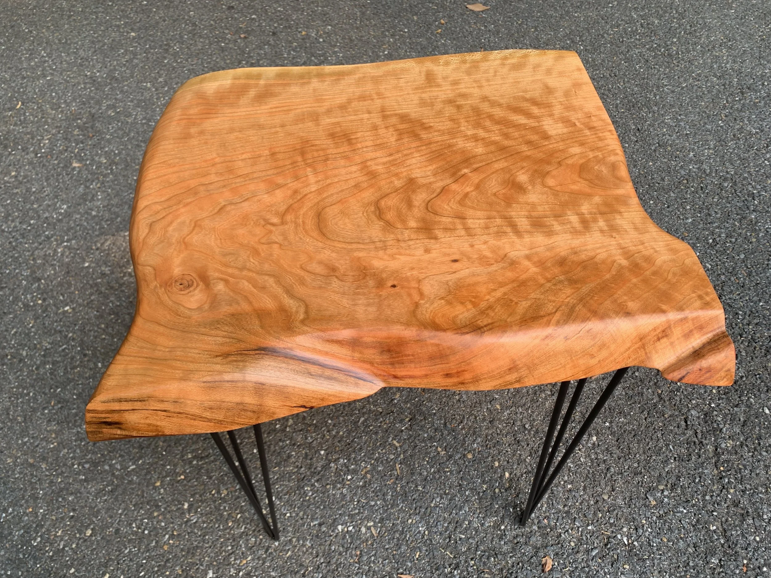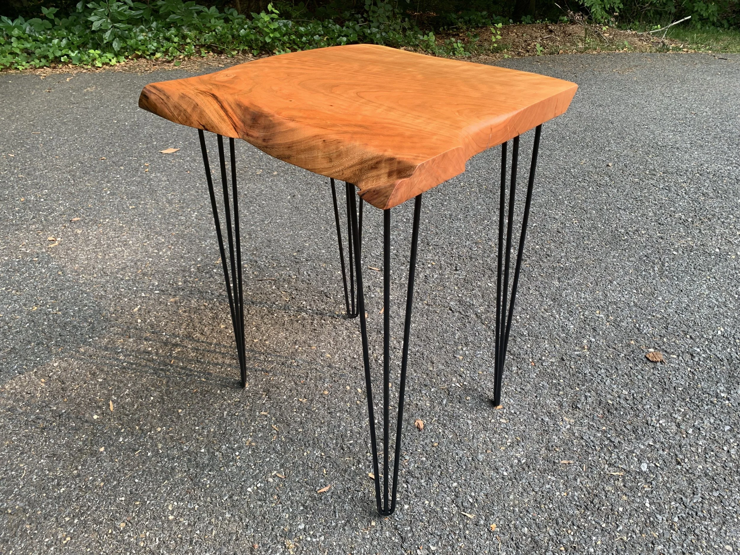 Overall, the cherry live edge slab side table finished with Rubio Monocoat is a striking and functional addition to any space. Its natural and irregular shape, along with the warm tones of the cherry wood, creates a visually appealing and inviting piece of furniture. Whether placed in a living room, bedroom, or office, this table is sure to become a focal point, showcasing the beauty of nature in your home.